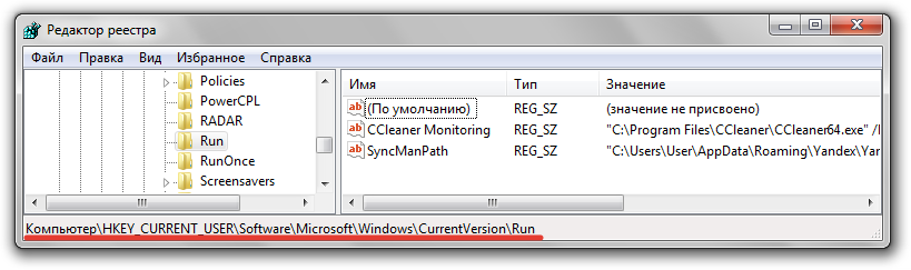 Далее осуществляется переход к папке HKEY_CURRENT_USER\ SOFTWARE\ Microsoft\ Windows\ CurrentVersion\ Run.